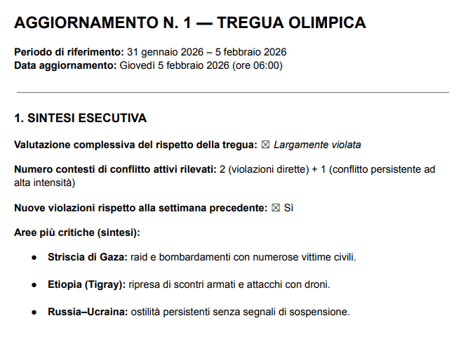 La tregua viene monitorata – a partire dal 30 gennaio – grazie alla collaborazione con l’Atlante delle guerre del Mondo, che ogni venerdì pubblicherà un report sul sito www. unimondo.org. Il primo report è uscito il 6 febbraio, giorno dell’inaugurazione dei Giochi, al termine della prima settimana di tregua olimpica.